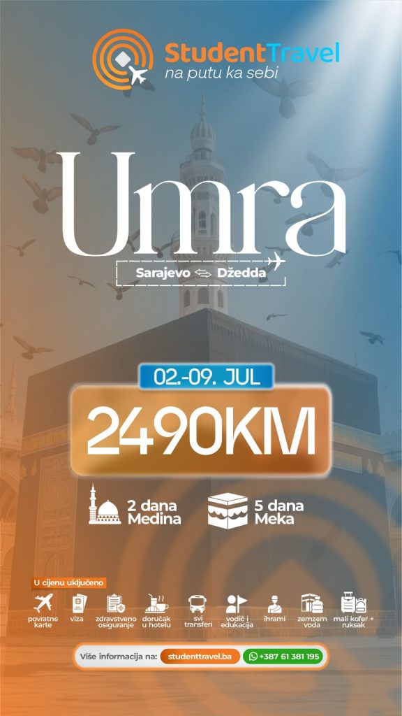 Otkrijte nezaboravno duhovno putovanje na Umru uz naše standardne pakete po pristupačnim cijenama. Pružamo vam mogućnost da iskusite sveta mjesta Mekke i Medine uz udoban smještaj, kvalitetnu uslugu i stručno vođenje, omogućujući vam da ostvarite svoje duhovne ciljeve bez opterećenja visokim troškovima. Iskoristite priliku da obavite Umru na jednostavan način uz našu pouzdanu podršku i uživajte u jedinstvenom iskustvu duhovnog putovanja po pristupačnim tarifama.